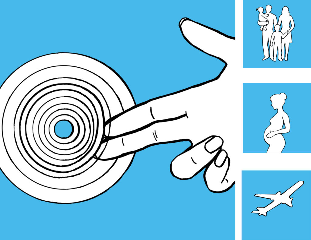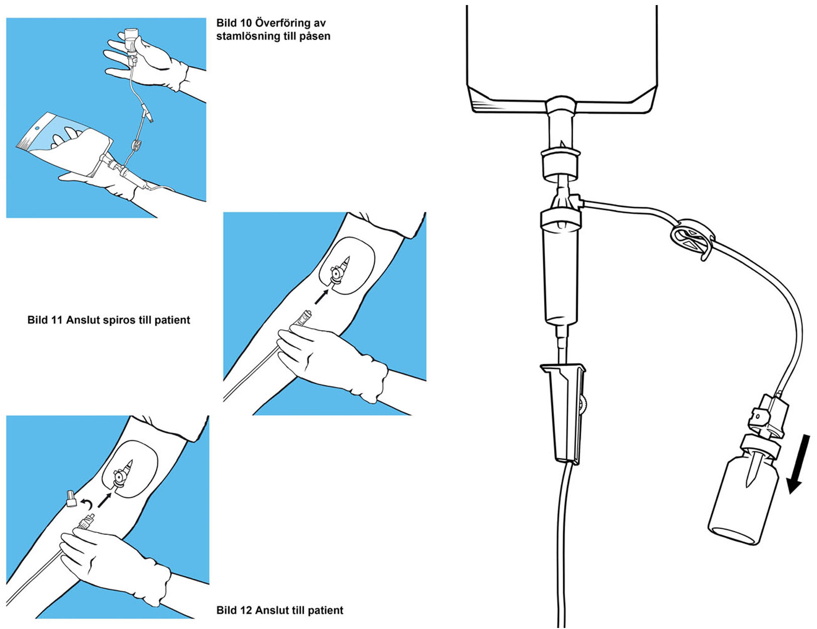 Företaget Mediplast behövde instruktiva illustrationer till olika medicinska produkter, allt från stomihäftor till dropp. Utmaningen var att hitta ett snyggt och igenkänningsbart manér som kunde fungera också i extremt små format (på enskilda förpackningar). Att utöver svart/vitt använda ytterligare en färg bidrar till att snabbt kunna avkoda bilden och särskilja det betydelsebärande från bakgrunden.