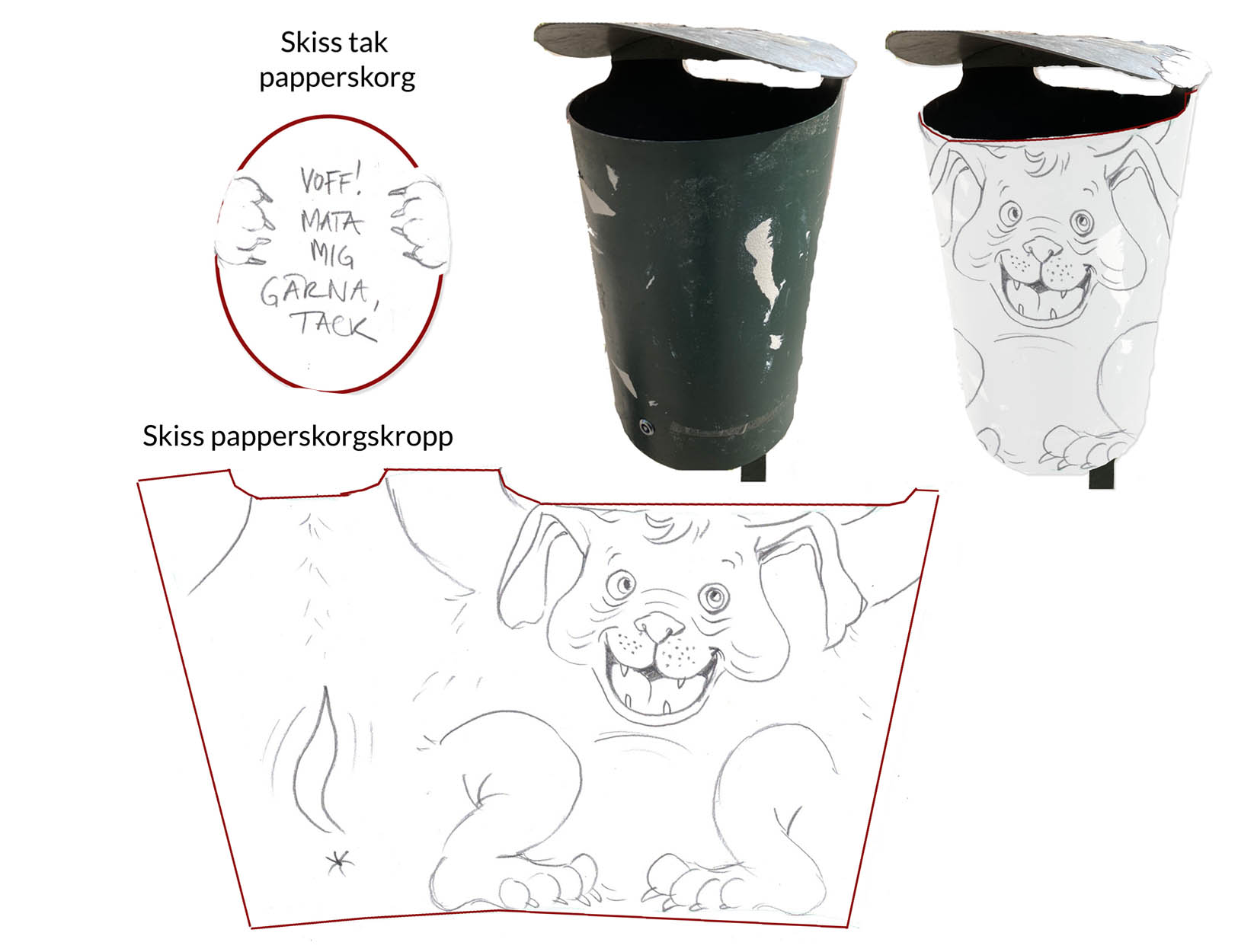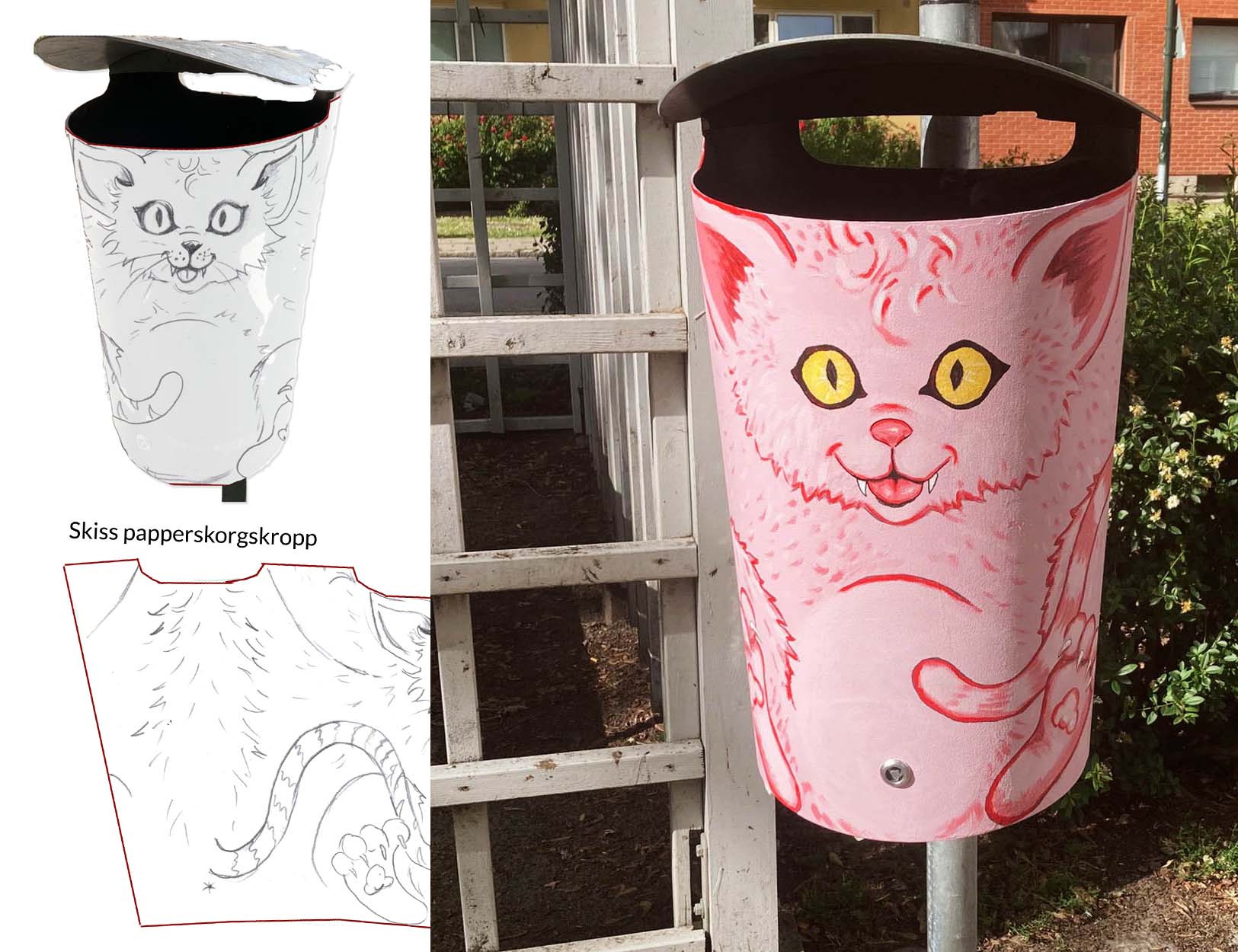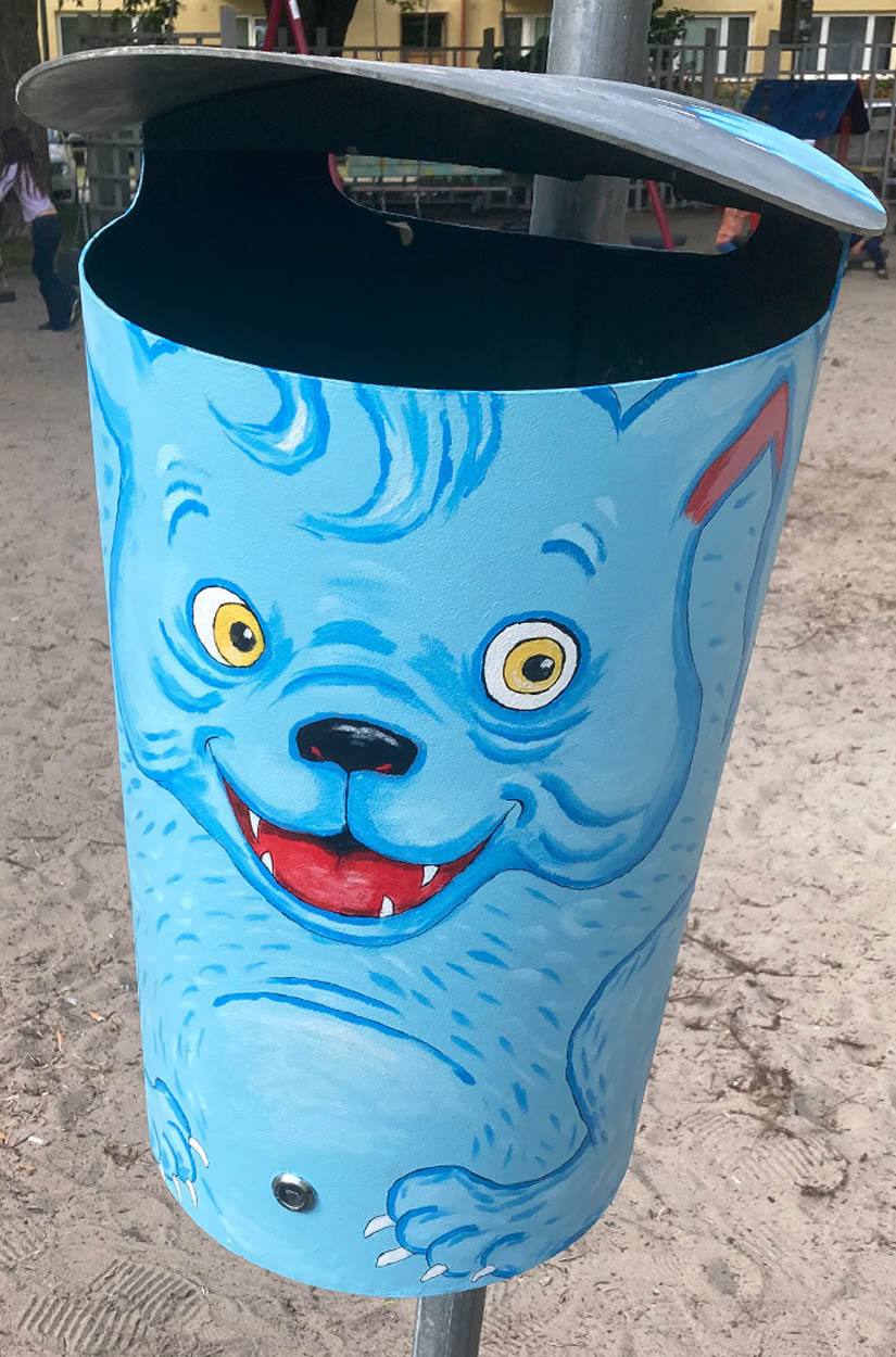 Uppdraget från fastighetsägarföreningen BID gick ut på att måla två papperskorgar vid lekplatsen på Sevedstorg (ett barnrikeområde i Malmö). Önskemålet var att det skulle vara en hund och en katt. Utformningen på papperskorgarna fick avgöra designen på figurerna. I detta fallet målade jag papperskorgarna på plats. Ett annat mindre väderberoende alternativ skulle vara att trycka motiven på vinyl som sedan monteras på papperskorgarna.