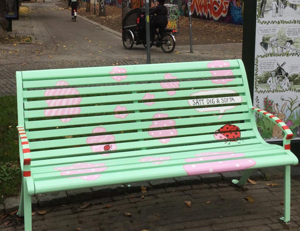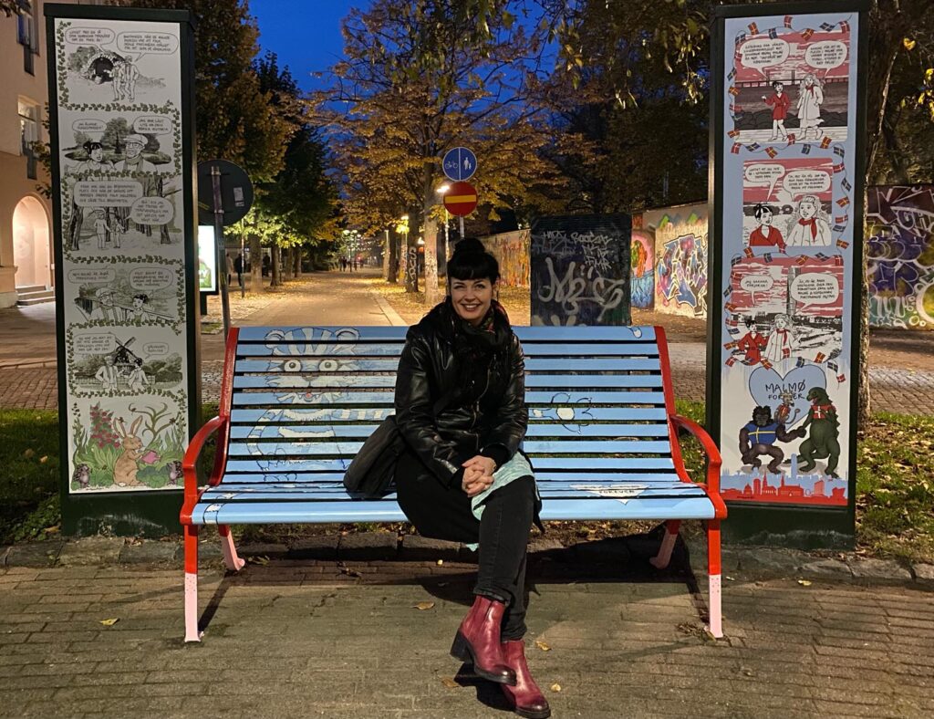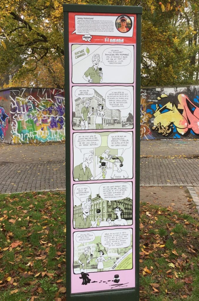 Som en del av ”Seriestaden Malmö” fick jag och tre andra serieskapare i uppdrag att göra en utsmyckning av rondellen vid Kristianstadsgatan i Malmö. Uppdraget var att skapa 5 stående serievepor samt att måla 2 parkbänkar var.