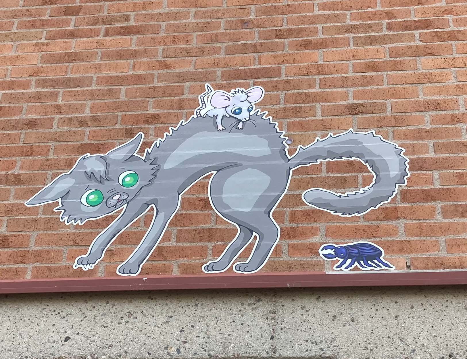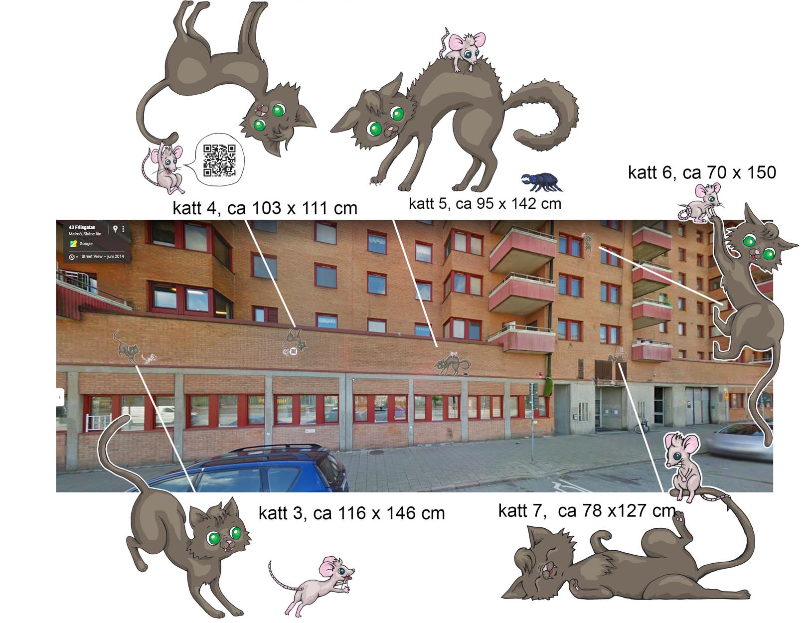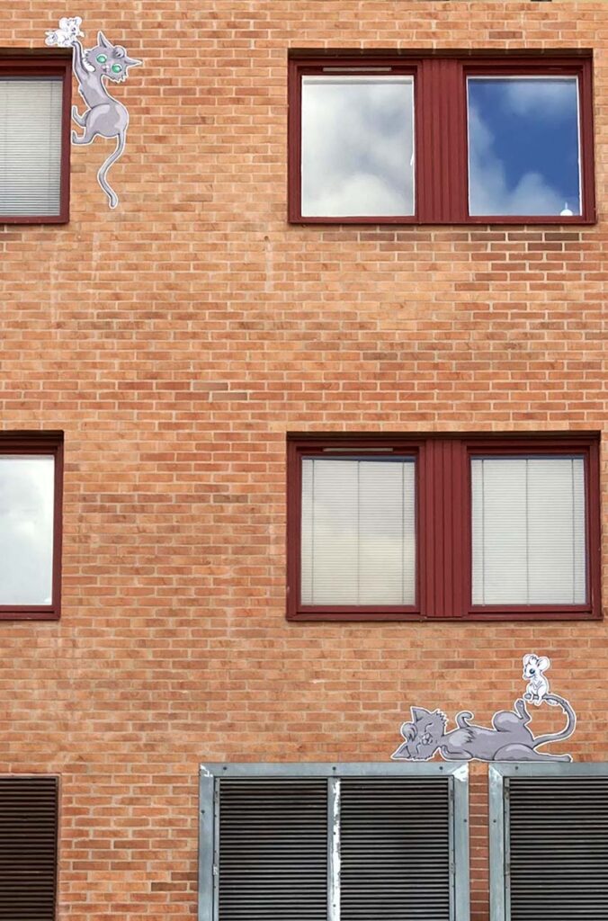 I Heimstadens fastighet på Friisgatan 45, bredvid Folkets park, är hem till Solkattens Förskola. Som en del av ”Seriestaden Malmö” skapade jag en ordlös serie med en katt och en mus som leker runt på fasaden. Barnen på förskolan fick välja utseende på katten och musen och en av barnens teckningar integrerades i en tankebubbla ovanför katten och musen som placerade precis ovanför ingången till förskolan.